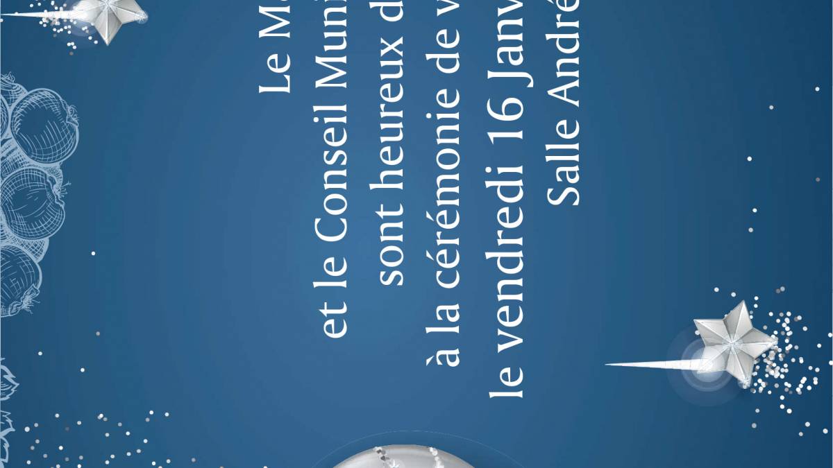 Cérémonie des Voeux 2026 Cérémonie des Voeux 2026 Publié le 08 janvier 2026 / Dernière modification le 08 janvier 2026 Cérémonie des Voeux 2026 Publié le 08/01/2026 - Dernière modification le 08/01/2026 Le vendredi 16 janvier 2026 de 19:30 à 22:00 Le Maire et le conseil municipal vous convient aux vœux 2026 Salle André CAZADE à 19h30