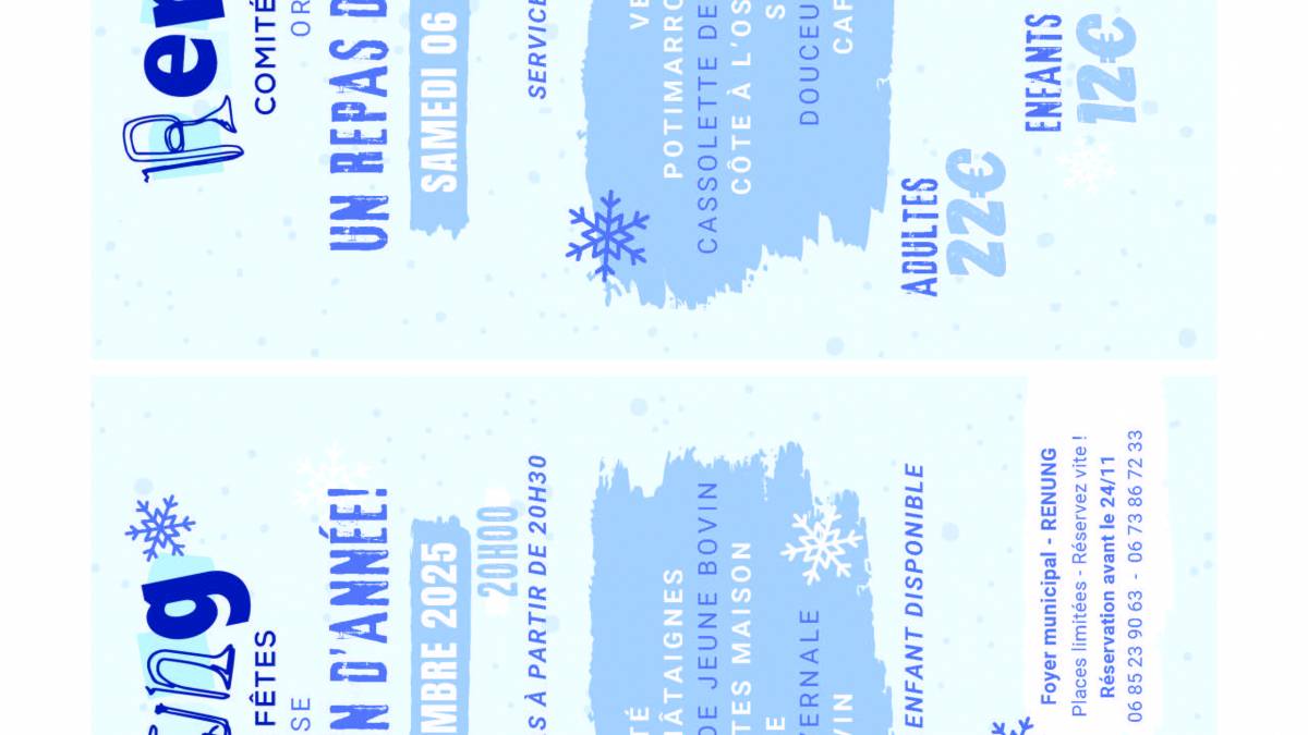 Repas fin d'année Repas fin d'année Publié le 09 novembre 2025 / Dernière modification le 09 novembre 2025 Repas fin d'année Publié le 09/11/2025 - Dernière modification le 09/11/2025 Le samedi 06 décembre 2025 de 20:00 à 23:59 Organisé par le Comité des fêtes de Renung Foyer Municipal - Salle André CAZADE