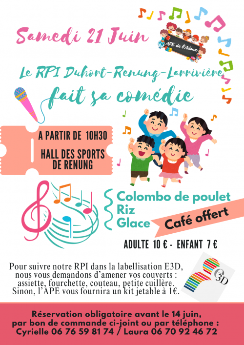 Spectacle RPI Duhort-Renung-Larrivière Spectacle RPI Duhort-Renung-Larrivière Publié le 10 juin 2025 / Dernière modification le 10 juin 2025 Spectacle RPI Duhort-Renung-Larrivière Publié le 10/06/2025 - Dernière modification le 10/06/2025 Le samedi 21 juin 2025 de 10:30 à 15:00 Le RPI Duhort-Renung-Larrivière fait sa comédie! A partir de 10h30 Hall des sports de Renung
